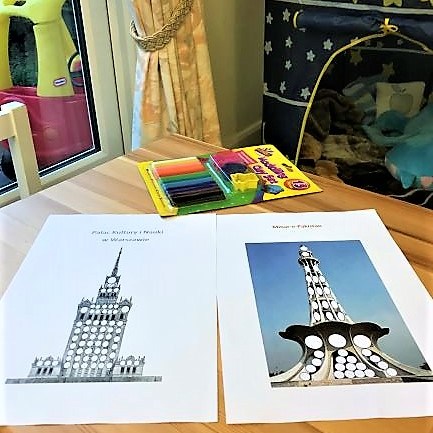Z polskich budynków wybrałam zdjęcie Pałacu Kultury i Nauki w Warszawie. W rzeczywistości PKiN ma jak wiadomo dość ponure odcienie. Ale z pomocą dziecięcych paluszków mogliśmy mu nadać więcej kolorów. Swoją drogą muszę przyznać, że był to pierwszy raz kiedy bawiliśmy się plasteliną (wcześniej była ciastolina i inne mieszanki). Sam zapach plasteliny przypomniał mi moje dzieciństwo. Bardzo przyjemne uczucie.