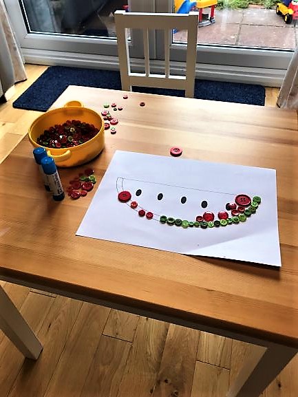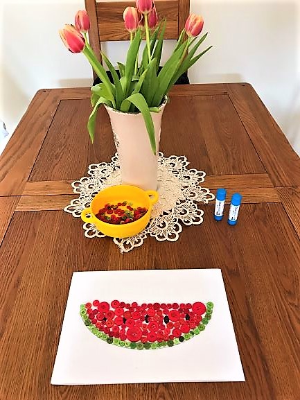 Today, we were using button art to create some beautiful pictures. I have seen some of the pictures made with buttons and they impressed me. I thought that with such a young man like my Kamil we can create something pretty as well. Of course, I had to watch him all the time in case any button disappear in his mouth. Kamil loved it anyway. We chose a picture of watermelon as a one of the most common Pakistani fruit and the one we absolutely love in our family!