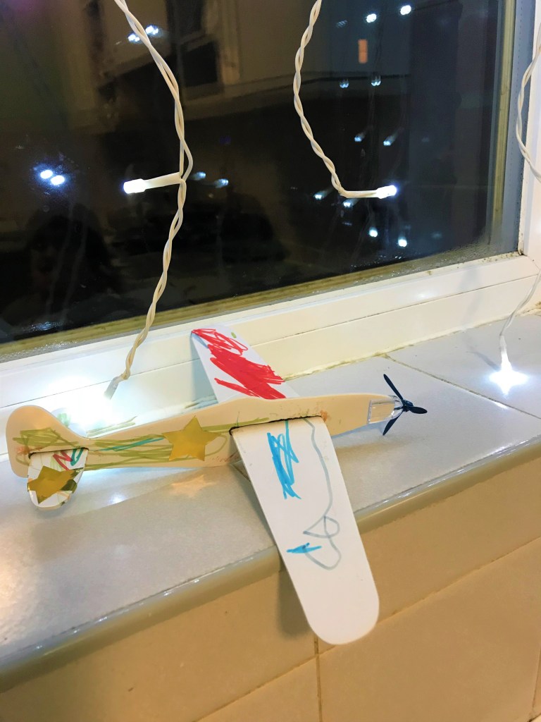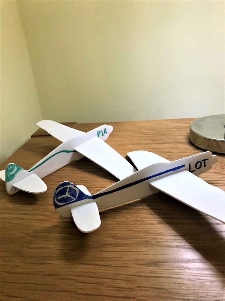 Do tego czasu, będziemy szukać różnych rozrywek domowych. poniżej mamy kolejną propozycję. Jestem pewna, że bardzo spodoba się ona chłopcom, ale myślę, że zainteresuje również dziewczynki. Przez internet zamówiłam szybowce z pianki. Łatwo się je składa, a ponieważ na początku były w częściach, więc łatwiej je było pokolorować. Dzieci tworzyły swoją własną twórczość, a ja pomalowałam dwa samoloty w barwach LOT-u i PIA (Pakistani International Airlaine). Niestety zapomniałam o narysowaniu okien dla pasażerów. Wyglądałyby wtedy na pewno lepiej, ale dzieci i tak bawiły się nimi wybornie. Oczywiście nie zabrakło oklasków dla ich kolorowych samolotów.
